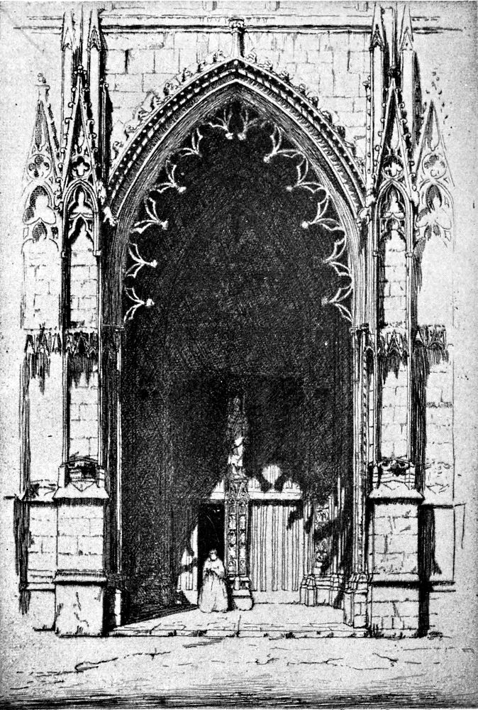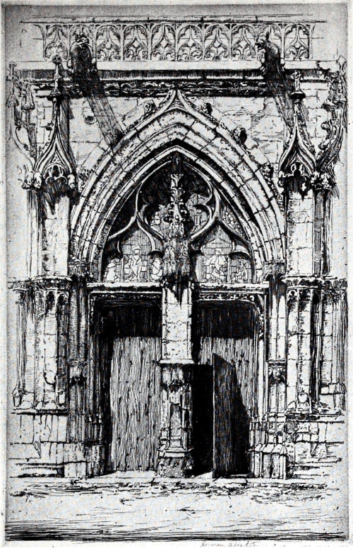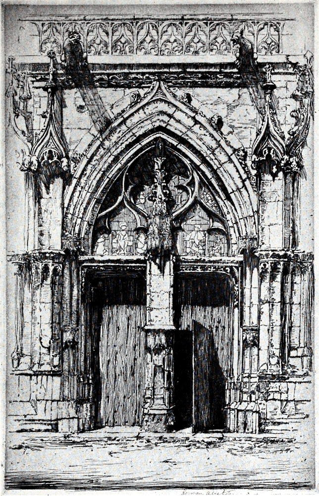 “Gothic canopies and tracery are drawn with loving care in the Porte des Marmousets, St. Ouen, Rouen, but here again it is the mystery of shadow in the deep porch that supplies the true theme.” Martin Hardie.