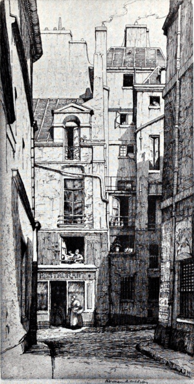 The artist’s subtle perception of light and his refined draughtsmanship have been used to singular advantage in the Ancienne Faculté de Médecine, 1608. One is grateful to him for his fine record of this [Pg 247]domed building that was a little gem of Renaissance art, though there is a note of sadness in the substructure of balks and struts set at its base by the ruthless hand of the destroyer.