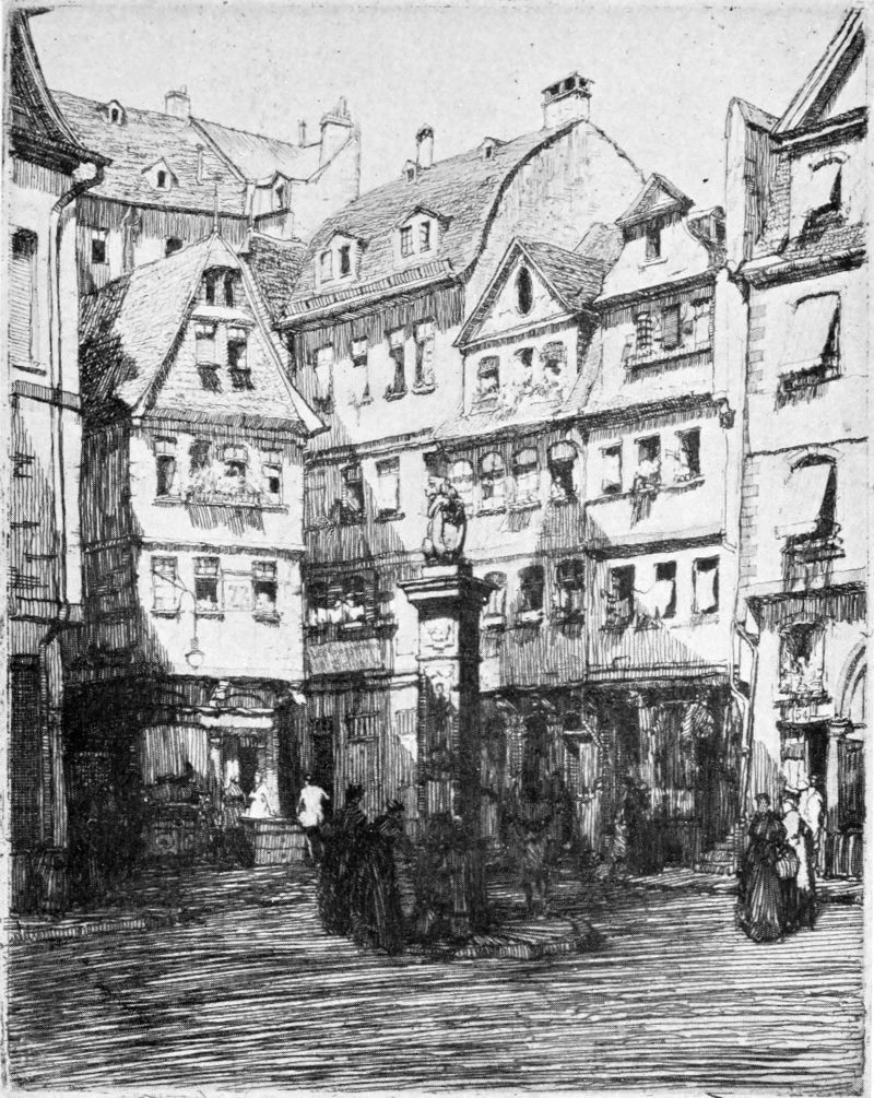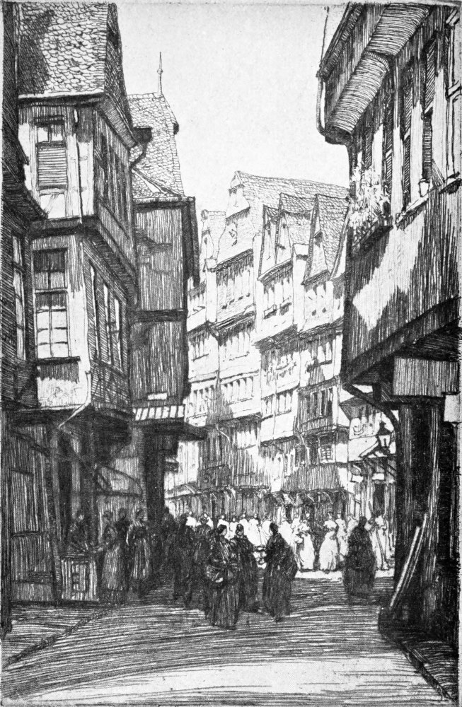 Frankfort has grown to be a large and very modern town with broad thoroughfares and palatial buildings; but it has its old quarter as well, and among the houses that nestle in narrow streets round the cathedral, Webster has found the same kind of subject that fascinated him before in Bruges and Marseilles and Paris. A brilliant draughtsman, he never seems to hesitate or lose his way among the manifold intricacies of the old-world buildings that he depicts. He aims always at knitting his subjects into fine unity of composition by broad massing of light and shade. “In the last few months,” he writes, “I have grown never to make an etching for etching’s sake, but for the means it gives of studying closely the play of light across my subject.” That is his main theme: the light that travels now with cold curiosity as it did centuries ago, glancing into open windows, throwing into relief a corbel or a crocket, casting a shadow under eave or window ledge, revealing, like a patch in some tattered garment, the cracks and seams in moldering plaster or time-worn timber. In depicting these storehouses of human joys and aspirations, hopes and despairs, he has none of Meryon’s gloom and morbidness. It is true that behind many of the windows in these poor homes of his pictures some Marie Claire may be toiling in sad-eyed poverty; yet for Webster the outside shall be sunny, little white curtains shall veil the gloom, and flowers shall blossom on the window [Pg 255]ledge, though the sad worker may have watered them with her tears. And if sunshine is still potent in these new plates, there is also a fresh and joyous note of life and movement in the streets. The introduction of figures, well placed and full of character, is a new development in Webster’s art. Bustling workers, or happy groups of gossiping women, or the dark mass of a distant crowd, are introduced with consummate skill, and the picturesqueness of the old streets gains new value from the suggestion of this living stream of human traffic. The presence of modern life enhances the gray and wrinkled age of the buildings which have watched so many generations come and go.