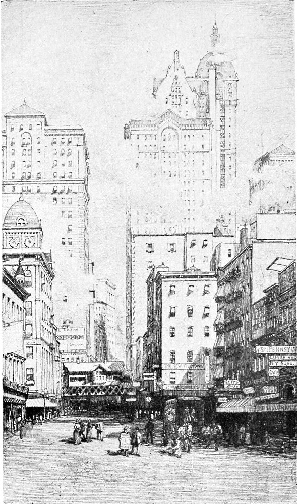 Still, there matters stood more than a year ago, and the plates that Webster had etched at Marseilles and elsewhere lay rejected and unbitten in his studio. Then he set out to America, where he spent the summer of 1910, and, like Mr. Pennell, fell a victim to the sky-scrapers of New York. “They are the most marvelous things,” he wrote, “on the face of Mother[Pg 252] Earth to-day. It took me two months to begin to see them, but then they began to glow, to take shape, and to grow. Perhaps no work of human hands in all the world offers such a stupendous picture as New York seen from almost anywhere within the down-town district, or from the river or the bay. There are cliffs and cañons where sun and shadow work the weirdest miracles, and soaring above them, between forty and fifty stories from the ground, rise arched roofs and pointed ones, gray and gold and brown, that one must see with one’s own eyes to have the faintest conception of. From across the Hudson in the afternoon when the sun goes down you can watch the shadows creep up the sides of these mountains of brick and stone until you’d swear you were looking out on some gigantic fairyland.”