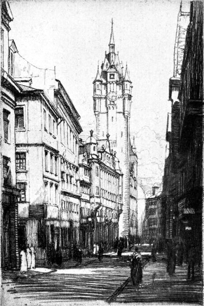 Before speaking of the Frankfort series of etchings, a word may be said about Webster’s pencil-drawings. I know of no other artist, save perhaps Mr. Muirhead Bone, who can use the pencil-point with such exquisite fineness and precision in the production of an architectural drawing that, with all its accuracy, still retains the freshness of a sketch. Finding in a portfolio a drawing of Cortlandt Street and several others that repeated the subjects of the Frankfort etchings, I felt curious as to the exact relationship between these drawings and the work on the copperplate. This interest was largely, perhaps, that of a fellow-etcher, keen to see “how the wheels go round,” but Webster’s reply to a question on this subject may interest others as well. “I determine my composition,” he wrote, “in outline first. This outline I transfer to the plate. Then I go out and carefully study in pencil, on the original outline sketch, the subject I want to do, so as to ‘get acquainted’ with it before beginning the more exacting work upon the copperplate. I never use a drawing to work from except sometimes as an extra guide in the biting, where a[Pg 254] careful study can be very useful.” They are beautiful things, these pencil-drawings of New York and Frankfort, but there can be only one of each. The etchings, fortunately, can be shared and enjoyed by many possessors.