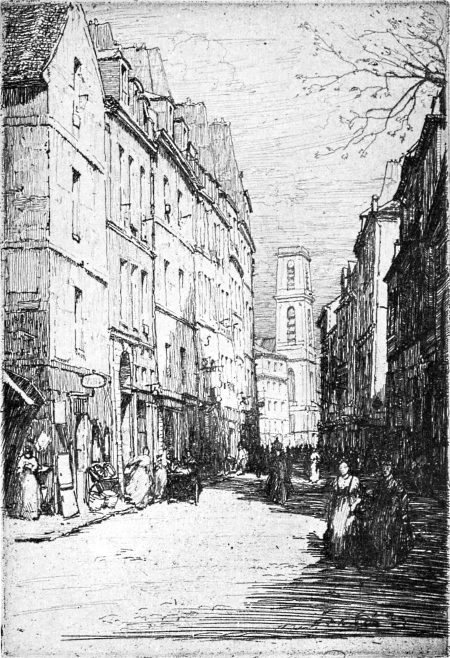 While he has surrendered for the time being to the charm of Frankfort, Webster has not been unfaithful to the Paris of his early love. Of Paris he might say, like Montaigne, “That city has ever had my heart; and it has fallen out to me, as of excellent things, that the more of other fine cities I have seen since, the more the beauty of this gains on my affections. I love [Pg 257]it tenderly, even with all its warts and blemishes.” All the more for the warts and blemishes of its old buildings Webster loves it, too; and while working on his Frankfort plates he has completed another of La Rue St. Jacques, Paris, which, I think, is one of the best etchings he has ever made. At times, even in his Frankfort plates, one still feels that his superb draughtsmanship and his love of detail—ce superflu, si nécessaire—have led him to a uniformity of finish that is almost too “icily regular.” I do not mean that Webster’s elaboration is the cold, almost meaningless, elaboration of the line-engraver; nor do I forget that the technique of Meryon, one of the greatest masters of etchings, was, in Mr. Wedmore’s happy phrasing, “one of unfaltering firmness and regularity, one of undeterred deliberation.” All the same, one wishes that Meryon had done a few more things like the Rue des Mauvais Garçons, and wishes that Webster also, in a similar way, were now and then less sure of himself, were held sometimes by a trembling hesitancy, or driven sometimes by the passion of the moment to allow room for fortunate accident and rapid suggestion. For that reason I welcome his Rue St. Jacques. It is not merely fine in its pattern of light and shade, but it has a direct force and simplification that are rich with promise for the future.