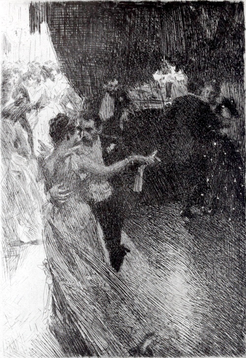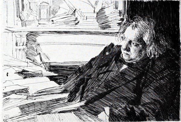 Zorn is concerned but little with abstract form or involved compositions. But he cannot be accused of evading difficulties through any fear of failure, as he has so convincingly demonstrated in his vivid, sun-flecked Interior of a Parisian Omnibus with its sharply characterized passengers, and in his dramatically effective Waltz with its assemblage of swaying figures moving rhythmically through the spacious ball-room, both marvels of discerning observation recorded with an almost clairvoyant magic of line that evoke the kaleidoscopic shimmer and brilliancy of the scenes depicted. The difficulties presented by these complex subjects are surmounted with the same nonchalant ease and certainty that distinguish his long series of individual portraits and figure pieces. That the latter predominate in the hierarchy of his etched work is a matter of choice rather than of chance and may, I think, be taken as an indication of his keen appreciation of the limitations as well as the possibilities of this medium. No one, not even Whistler, has realized more clearly than he that etching at its best is essentially an impressionistic art, to be practised only in the happiest moods, and his finest plates are marvels of swift, stenographic notations that have been scratched upon the copper direct from nature in a white heat of enthusiasm.