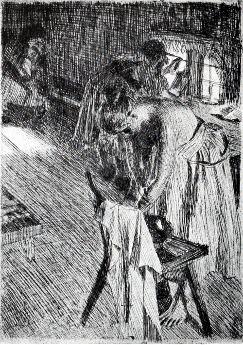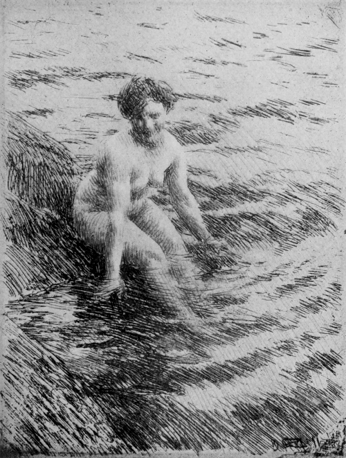 While Zorn to-day occupies a position of unchallenged supremacy in the difficult and exacting field of portraiture—his portrait etchings would alone make a notable Pantheon of contemporary worthies—it is in his frank, unabashed nudes and in his delineations of Swedish peasant types that we find the most personal expression of his peculiar genius. Nowhere has his faculty of instantaneous perception, his ability to grasp at a glance and in its entirety either an isolated individual or a group of figures, been employed to greater advantage than in these brilliant, dazzling nudes and in these veracious records of his beloved Dalecarlian peasants. With a few swift, sure strokes he gives us the soft contour, the undulating curves of the fresh, firm flesh, of these strong-limbed Junos, as well as the wrinkled, time-worn visages of the aged tillers of the soil.