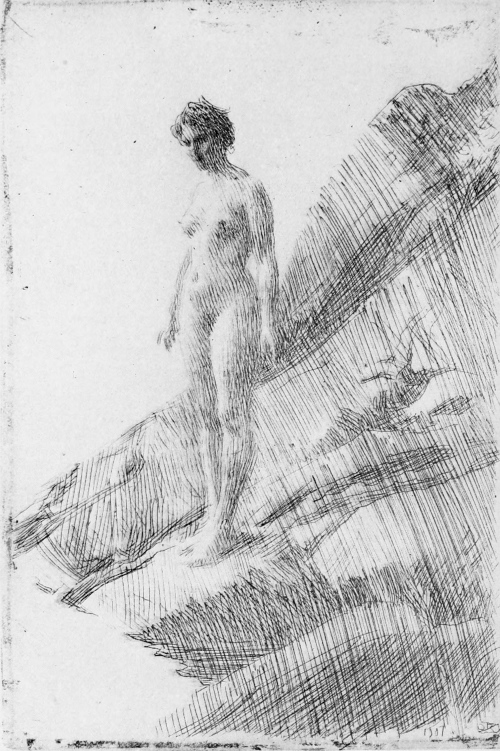 An ardent sensuousness marks all these things, but it is sane and wholesome, with no trace of doubtful submeaning. [Pg 267]That is strikingly exemplified in My Model and my Boat, in which the exuberant, re-creating force of life is presented in all its tantalizing seductiveness of ample, quivering curves. The beauty of vigorous symmetry, of inherent strength, overcome the somewhat obvious coarseness of the type of woman depicted here, and one can have nothing but admiration for the underlying sincerity as well as the consummate mastery revealed in every stroke of these plates. But the purely physical allure of his nudes is by no means always as insistent as in the foregoing. The elusive and half-reticent feminine charm has not escaped him, and there are some nudes out of doors, in the lambent light of dawn and twilight, more delicate, more subtly suggestive, than anything hitherto accomplished in etching.