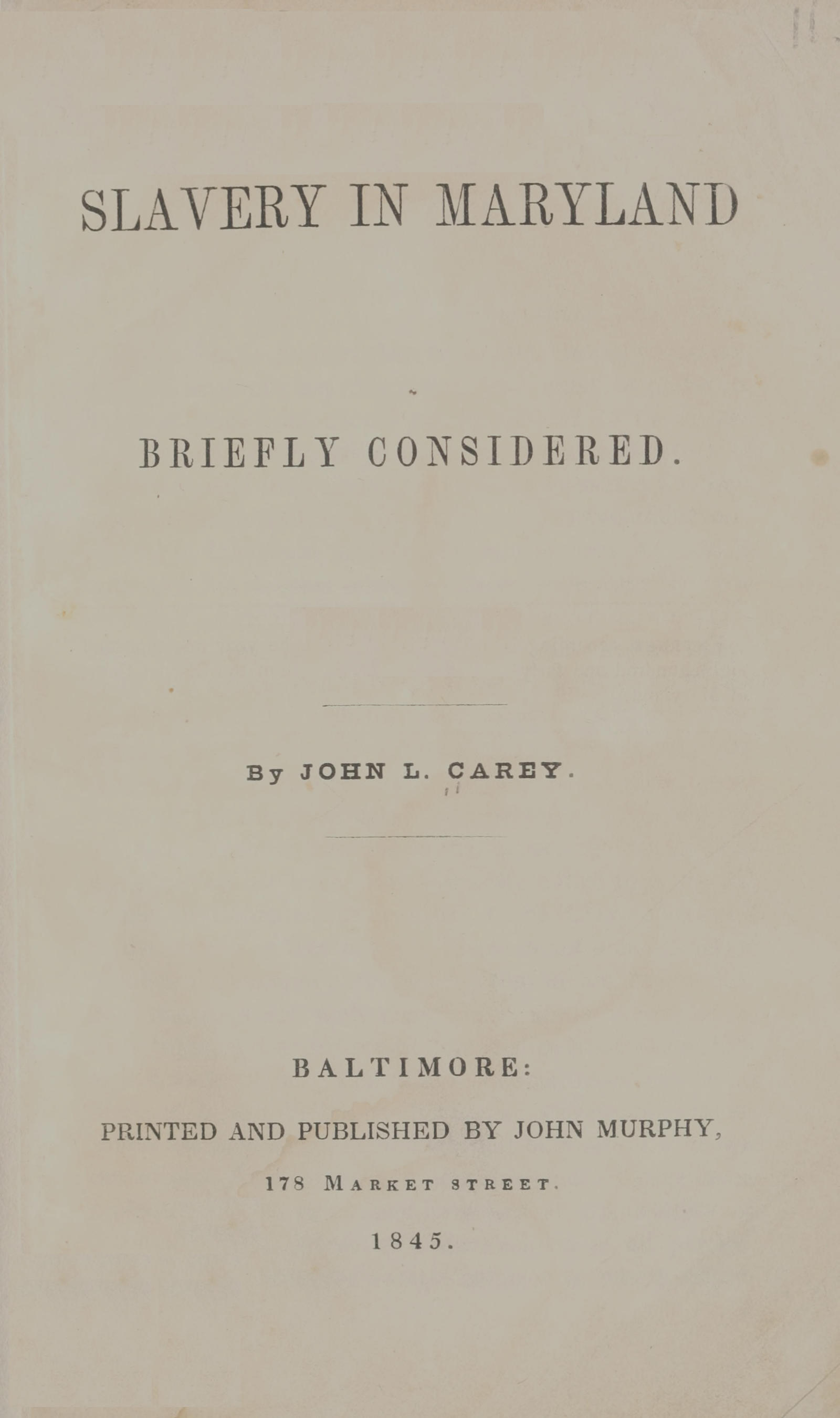 I propose to treat of Slavery in the State of Maryland, believing that a fair inquiry into that subject at the present time may lead to good results. The institution itself has existed long enough in this community, and has produced consequences sufficiently marked and decisive to enable an impartial observer to form a definite opinion of its nature and tendencies. I believe that such an opinion has been formed by the general mind of the commonwealth.