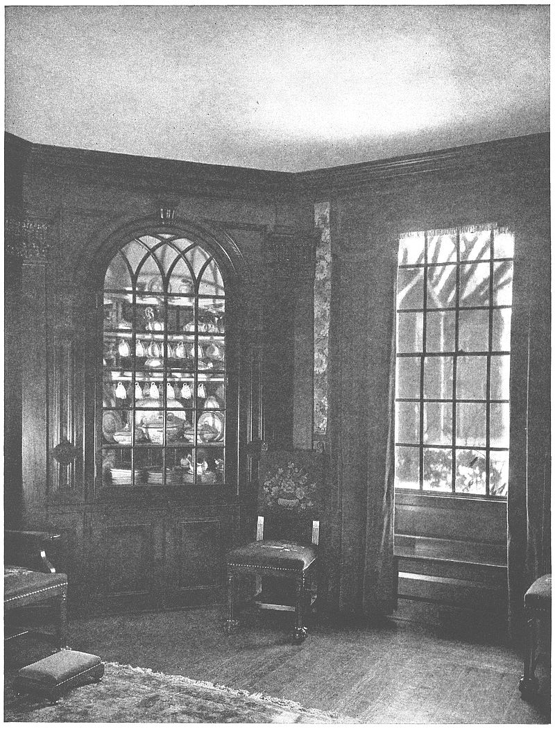 The house was sold by the Charles Jackson heirs in 1872 to Lucia J. Briggs, the wife of the Rev. George W. Briggs, who occupied it as a summer residence until 1898, when it was purchased by Charles L. Willoughby, of Chicago, for a summer home. Gardens were planned and planted. Joseph Everett Chandler, authority on the restoration of New England houses and author of books on the subject, was retained to supervise the work, and it is he we have to thank that so much was saved when it was converted into a gentleman’s estate. He it was who saw to it that the new windows, inner shutters, paneling, and many details, are in keeping with the original structure. He even saw to it that the Tory chimney, with its coping painted black, was saved and that the two lovely linden trees, said to have been planted by Edward Winslow’s daughter Penelope, were protected during the alteration. In tearing off the ell on the north side, a board was uncovered on which was painted “Built by William Drew 1820,” which indicates additions were made that year. The house was moved back thirty feet, raised five, porches were built, side doors, new rooms, and a cupola or, as some erroneously call it, a Widow’s Walk, were added.
