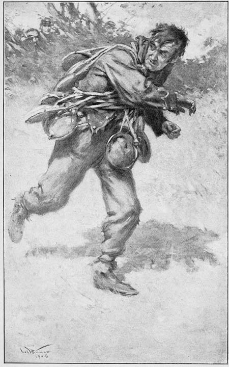 But although he himself could scarcely explain how it came to pass, he found himself a camp-follower, a drudge, a volunteer servant to the command of a general to whose fame he gave humble and admiring awe. At first the soldiers had tolerated him; gradually there had come a recognition of his willingness, his good-nature, his real cleverness. It somehow came to be believed that it was by some vagrant choice of his own that he was a member of Company Q, and none ever dreamed that he longed with pathetic intensity for his lost chance of being a soldier. On the march he wore a look of exaltation whenever, which was not seldom, two or three of the men would carelessly give him[19] their muskets to carry. In the camp he was happy if he could do some service—he would chop wood, build fires, and cook. And in time of battle he was perforce resigned when the soldiers marched by him into the smoke and the roar, leaving him behind to hold some officer’s horse or look after some tent.