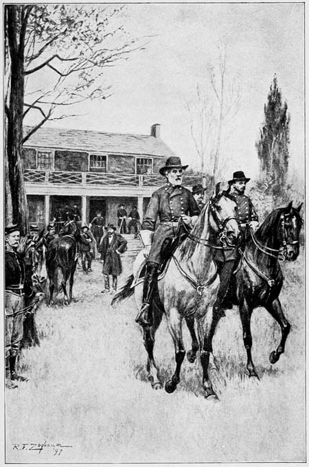 As soon as the Colonel had mounted, General Lee drew up his reins, and, with the Colonel riding on his left, and followed by the orderly, moved at a slow walk across the yard towards the gate.