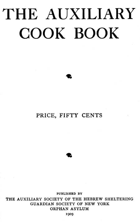 This valuable Cook Book is the product of the zeal and energy of the ladies comprising the Auxiliary of the Hebrew Sheltering Guardian Society of New York Orphan Asylum, who have labored in a noble cause for the benefit of their Cottage Fund. In compiling this work the members have exercised the greatest care in contributing their best and tried recipes, and have attached their signatures thereto.