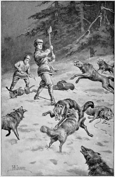 Suddenly the howl of a wolf was heard. Following instructions he stopped the team and tried to gather birchbark and bits of wood to build his fire. It was cold, forty below, and doubtless the lad was cold and numb from the cold and frost when the wolves surrounded him. Probably, also, the team became frightened at the wolves, had upset the sleigh and got away. Since there was no witness to the tragedy no one knew definitely. At the time of the lad’s probable arrival Scott ran outside the camp with a lantern and peered down the tote road. As time went by he became alarmed at the failure of the lad to arrive and suddenly, when he heard the dashing of hoofs and saw the team running madly[145] as if chased, he understood that something unusual had happened. With two men and a fresh team he started back over the tote road, and in a little time found their fears realized. Coming to the upturned sleigh, they saw shadowy forms sneaking away into the forest, and a little further on, underneath a tree beside the road, which the boy had evidently tried to climb, were torn boots and some bits of tattered clothing. Probably the lad had climbed the tree, but in his numb condition was unable to hang on and had fallen, becoming a prey to those ferocious brutes. While the lumber-jacks were in some respects hard men and had seen accidents and somewhat similar things before, their regard for the boy who had proved himself a real man made tears flow from their eyes, which froze into icicles as they trickled down their bearded faces. There before them, written on the snow around their feet, was the sad tale of how the heroic lad had met his end in the forest, doing his duty. Scott appreciated what this side of the tragedy would mean to the lad’s mother, fully realizing that she would appreciate how the lad had lived up to his duty, and would understand that God’s angels had been there to claim the spirit of her boy and take it up to a better home than earth affords.