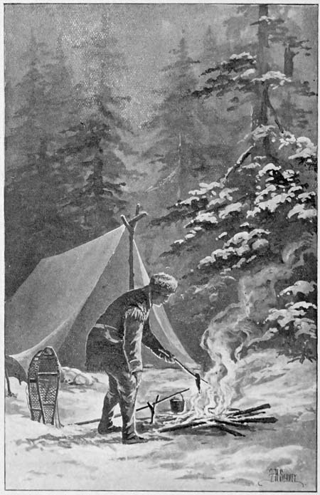 Learning that there was a shortage of teamsters. Kid, who knew a little about horses, offered himself for this work, and accordingly was assigned to team supplies for the camp along the tote road from the railroad, about sixty miles away. In sending him out Scott cautioned him of the danger from the wolves, particularly at night, and told him that if he[144] were caught out on the road after nightfall he was to stop and build a fire at the first howl. Failing time for this he was to unhitch his team, climb on their backs, and make the camp the best way he could. He was instructed, however, to provide against being out after night by leaving the Halfway house, thirty miles from camp, at daybreak.
