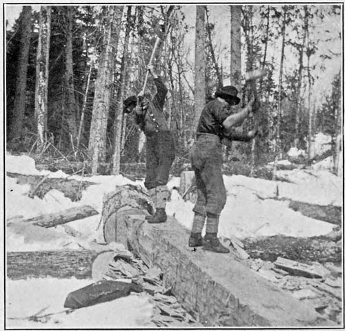When the winter’s work was completed and the men and teams were leaving their quarters, many a man turned to cast a last look at the camp where various joys had been known, where gloom had been shared by all and where trial and difficulty had been overcome. The procession of men, who through their experiences together that winter had become a sort of family, a brotherhood, wended their way along the tote road. Looking at them none could deny that these lumber-jacks were a noble breed of[148] men. The sons and grandsons of pioneers, men of the north, conquerors of the forest, bound together by a chain of chivalrous deeds, of hardships and difficulties, they were doing their part in the building up of the future of a nation.