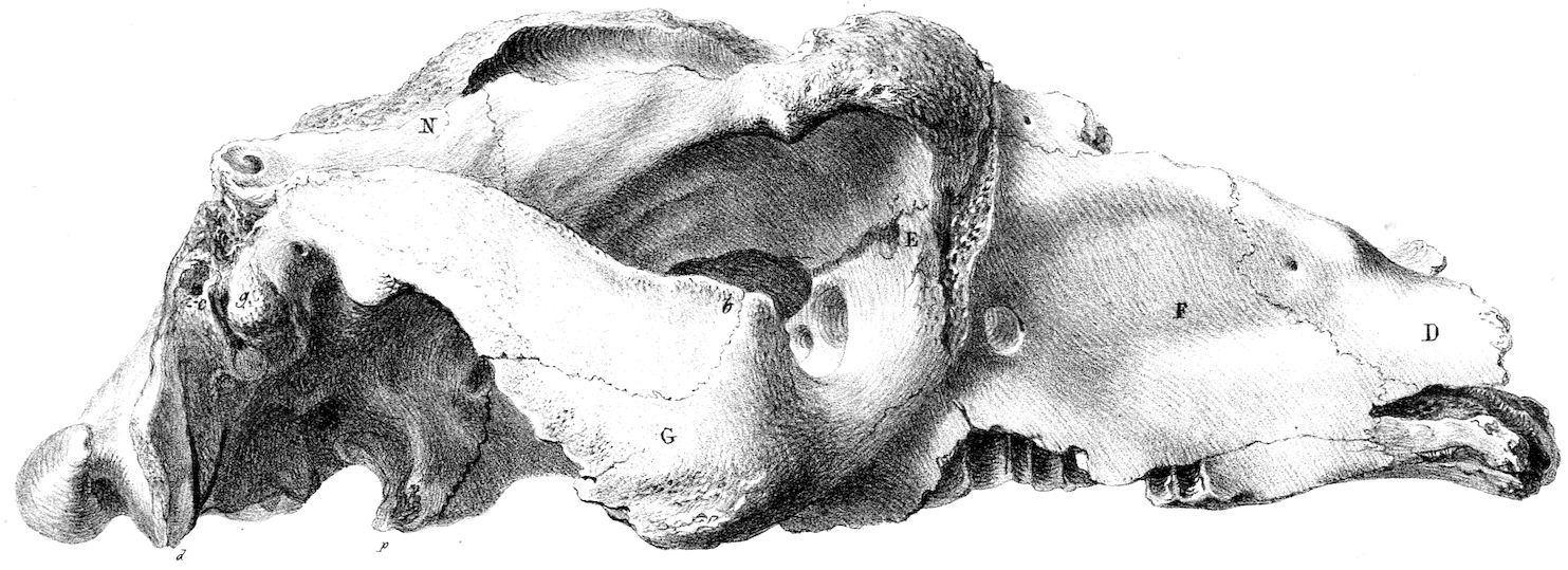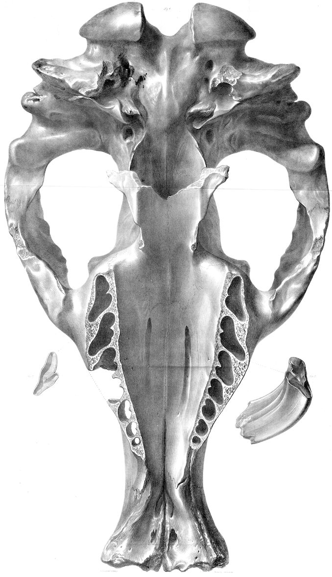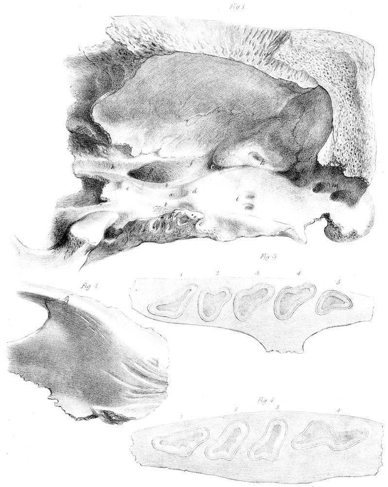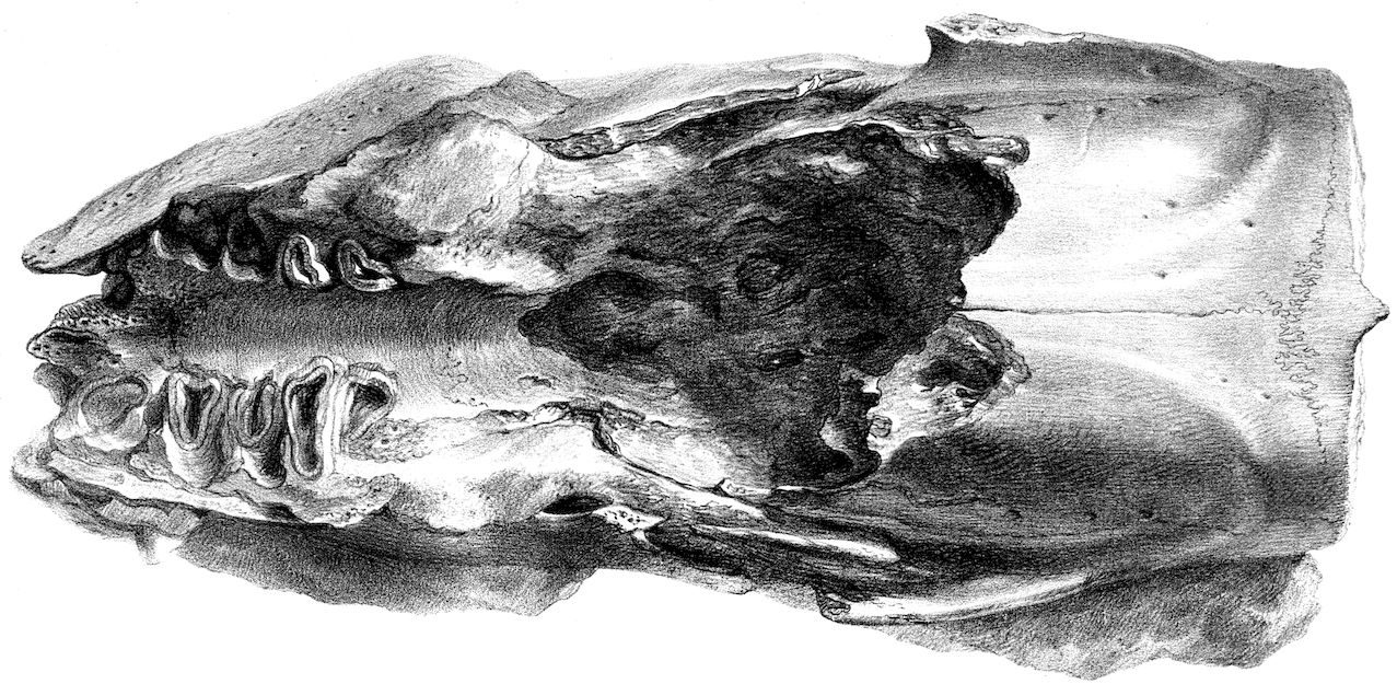 | Plate I. | Cranium of Toxodon Platensis, nat. size, basal view, with the sixth molar, right side upper jaw, and grinding surface of the seventh molar left side. |