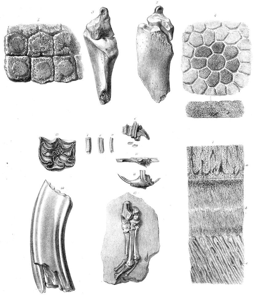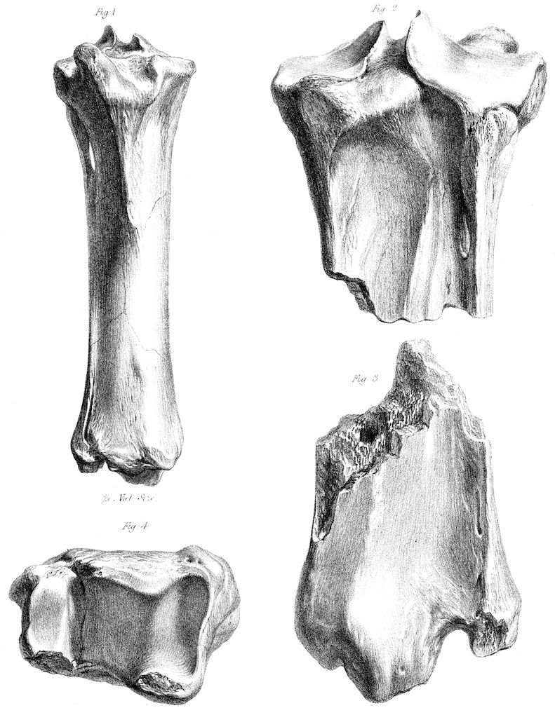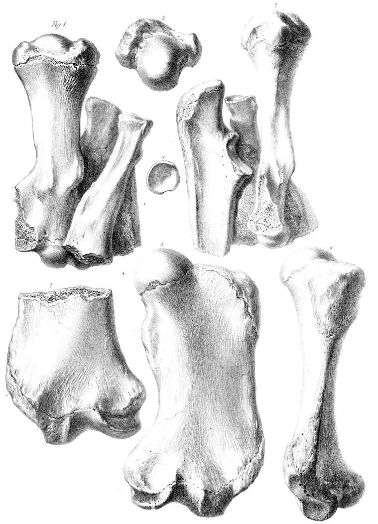 Fig. 1. Megatherium. ⅓ Nat. Size. Fig: 2. Scelidotherium. ⅔ Nat. Size. Fig. 3–6, Mylodon.? ⅔ Nat. Size.