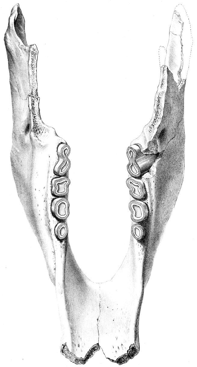 12. This was written before an examination of the fragment of a lower jaw, forming part of Mr. Darwin’s collection of Fossil Remains, had led me to suspect that it was referrible to the genus Toxodon; should this suspicion prove correct, the four unequal incisors of the upper jaw are opposed to six equal sized ones in the lower.