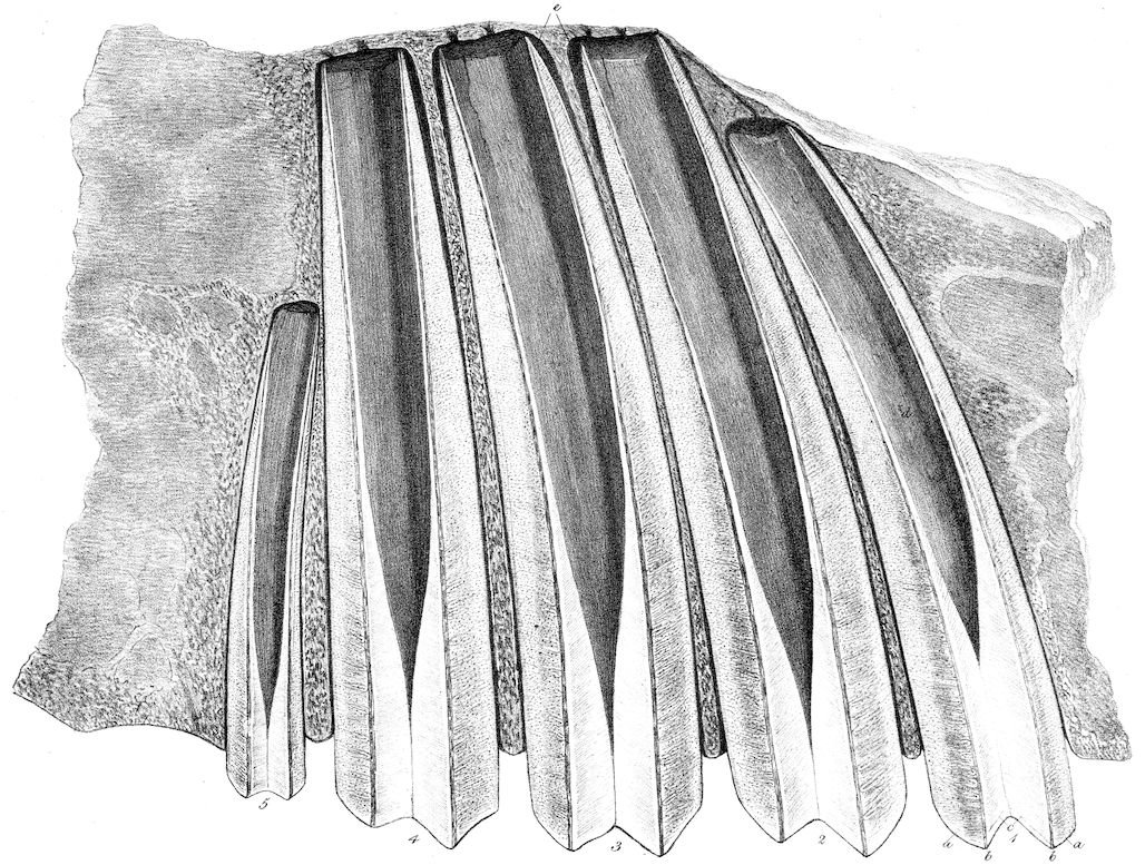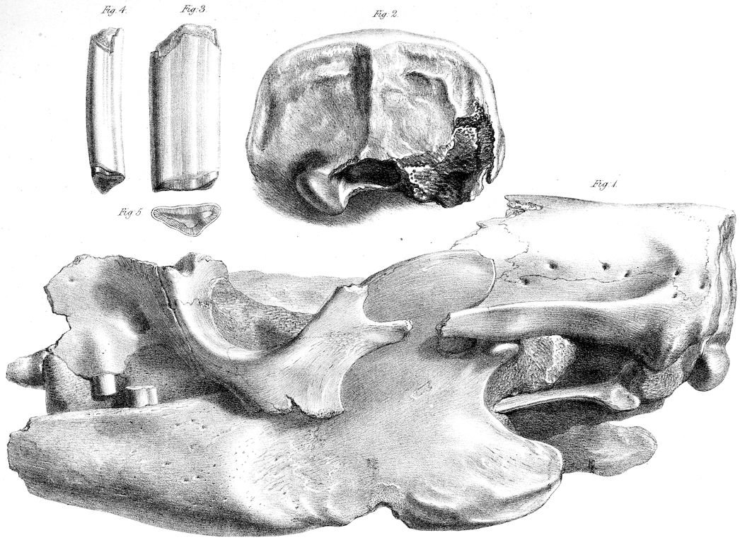 39. Harlan’s Medical and Physical Researches, 1835, p. 334. M. de Blainville speaks of a cast of a fragment of a lower jaw “portant encore cinq dents en série;” as having been transmitted to the Museum of the Garden of Plants from North America, together with other bones, all of which he refers to the genus Megalonyx; M. de Blainville does not describe these teeth, which is to be regretted, inasmuch as, if he be correct in regard to their number, which can hardly be doubted, and if he wrote with any clear and definite ideas of the generic characters of Megalonyx, this would indicate that Megalonyx differed generically both from Megatherium and Mylodon in a more important dental character than has hitherto been suspected (See “Comptes Rendus, &c.” 1839, No. V. p. 142.)