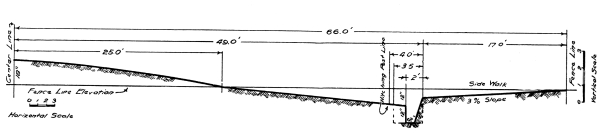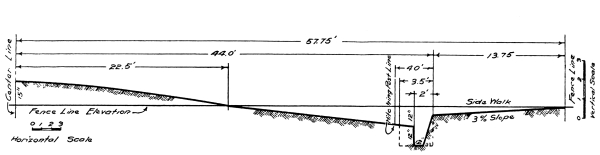The elevation of the crown of the road above the fence line varies from four inches to eighteen inches, the amount depending on the width of the street, and the depth of the drain ditches on the sides of the roadway is as shown some two feet below the grade of the fence line.