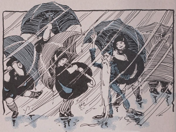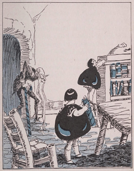 The Ink-Bottle Babies stepped inside, and they saw five and twenty little dwarfs sitting at a table, eating soup with their five and twenty little spoons. The little dwarfs got up politely and offered their seats to the Babies and they sang,