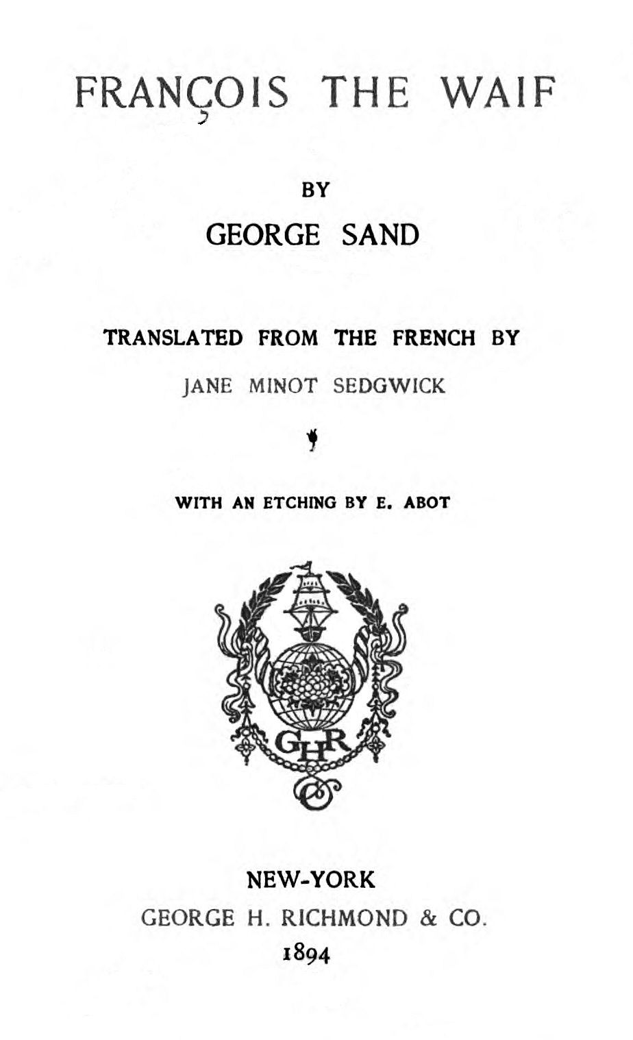 François le Champi, a pretty idyl that tells of homely affections, self-devotion, "humble cares and delicate fears," opens a little vista into that Arcadia to which, the poet says, we were all born. It offers many difficulties to the translator. It is a rustic tale, put into the mouths of peasants, who relate it with a primitive simplicity, sweet and full of sentiment in the French, but prone to degenerate into mawkishness and monotony when turned into English. Great care has been taken to keep the English of this version simple and idiomatic, and yet religiously to avoid any breach of faith toward the author. It is hoped that, though the original pure and limpid waters have necessarily contracted some stain by being forced into another channel, they may yet yield refreshment to those thirsty souls who cannot seek them at the fountain-head.