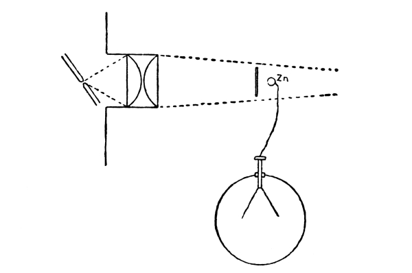 (e) If the experiment is made with a copper gauze and a zinc plate, the phenomenon nearly disappears on varnishing the gauze. His hypothesis is that radiation produces convection of negative electricity, the carriers being molecules of air.