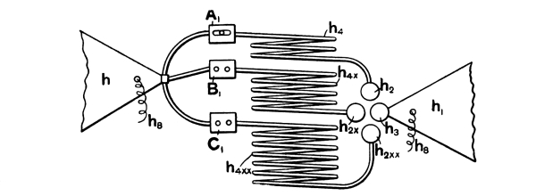 While trying to re-establish syntony between primary and secondary, I found that the period of the resonator was considerably increased by the cylinders 2-4, but that the maximum spark length was much diminished. With the cylinders Nos. 5-9 in the spiral, it was no longer possible to establish syntony, “a fact which is certainly due to their considerable absorption of energy. Take, for example, cylinder 9: electromagnetic energy must converge rapidly towards it in order to be transformed, and the space finds itself empty of energy as air is exhausted of vapour in presence of an absorbing substance.”