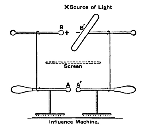 (f) The carrying molecules move along the lines of force, and throw electric shadows. To show this he varnishes a zinc cylinder, all except a generating line, charges it negatively to 1,000 volts with a [Pg 128] dry pile, and places it parallel to a large earth-connected plane, which has a narrow rectangular portion insulated from the rest and communicating with an electrometer. Light only acts on the uncovered line of the cylinder, and on turning the cylinder round the electrometer is only deflected when it is exposed to some of the (circular) lines of force emanating from the active line of the cylinder.