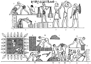 Figs. 8, 14. Making bricks with a wooden mold, d, k.