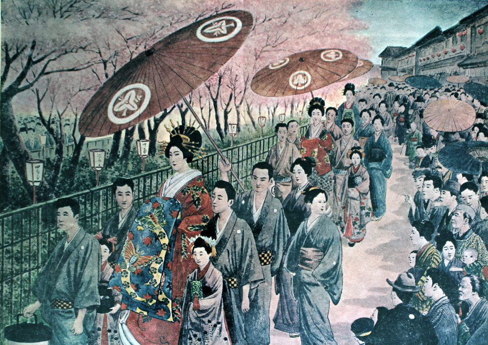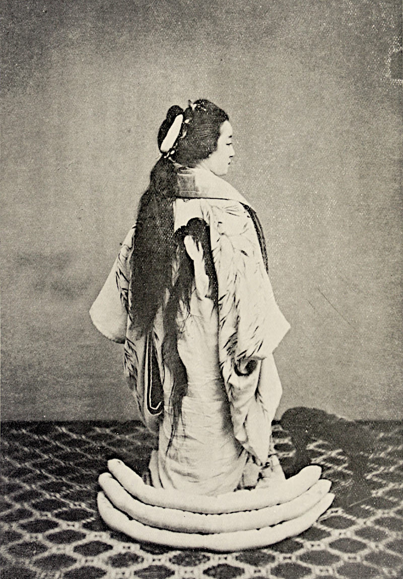 Another explanation is that the oiran were so beautiful that even when an old person (Oi-taru mono) met them he was apt to be excited, agitated, and half crazy (亂 = ran) for the love of their pretty faces. Thus the word oi+ran (an aged person + excited half crazy with agitation). The word “oiran” is written 花魁 (hana-no sakigake) and means “the leader of flowers” (i.e.—the most beautiful of all flowers) because a beautiful woman may be compared to a flower, and oiran occupy the same position among other courtesans as the cherry does among other flowers.