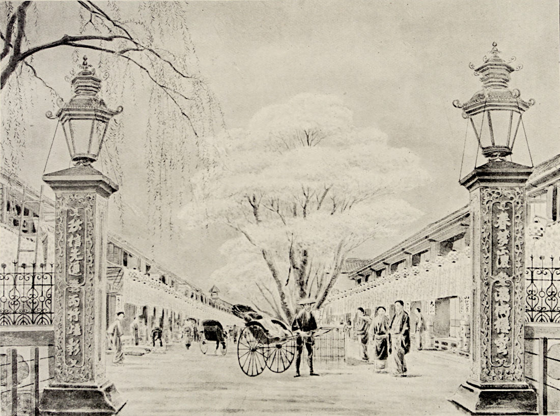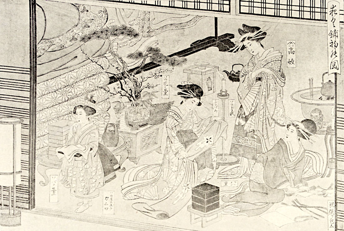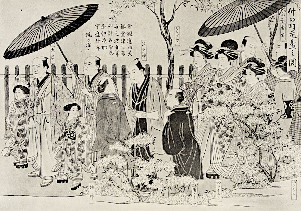 The “Kinsei jibutsu-Kō” (近世事物考 Reflections about modern things) says:—the higher priced women of the Shin Yoshiwara are now called “oiran” The reason for giving them this name is that in the era of Genroku (1688–1703) the courtesans of the Yoshiwara all planted a large number of trees in the Naka-no chō (central street). About this time a Kamuro (female page) attached to a certain house called the “Kishida-ya” wrote a stanza of poetry which ran:—