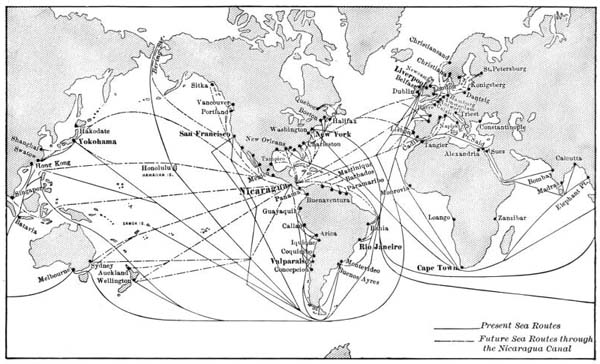 | MAP OF THE WORLD SHOWING CHANGES IN TRADE ROUTES AFTER THE COMPLETION OF THE NICARAGUA CANAL | 191 |
