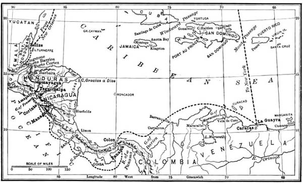 The government of Venezuela at the time of our visit to Caracas was greatly troubled on account of her boundary dispute with Great Britain, and her own somewhat hasty action in sending three foreign ministers out of the country for daring to criticise her tardiness in paying foreign debts and her neglect in not holding to the terms of concessions. These difficulties, the latter of which were entirely of her own making, were interesting to us as Americans, because the talk on all sides showed that in the event of a serious trouble with any foreign power Venezuela looked confidently to the United States for aid. Now, since President Cleveland’s so-called “war” message has been written, she is naturally even more liable to go much further than she would dare go if she did not think the United States was back of her. Her belief in the sympathy of our government is also based on many friendly acts in the past: on the facts that General Miranda, the soldier[270] who preceded Bolivar, and who was a friend of Hamilton, Fox, and Lafayette, first learned to hope for the independence of South America during the battle for independence in our own country; that when the revolution began, in 1810, it was from the United States that Venezuela received her first war material; that two years later, when the earthquake of 1812 destroyed twenty thousand people, the United States Congress sent many ship-loads of flour to the survivors of the disaster; and that as late as 1888 our Congress again showed its good feeling by authorizing the secretary of the navy to return to Venezuela on a ship of war the body of General Paez, who died in exile in New York city, and by appointing a committee of congressmen and senators to represent the government at his public funeral.