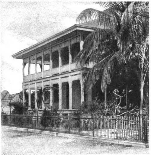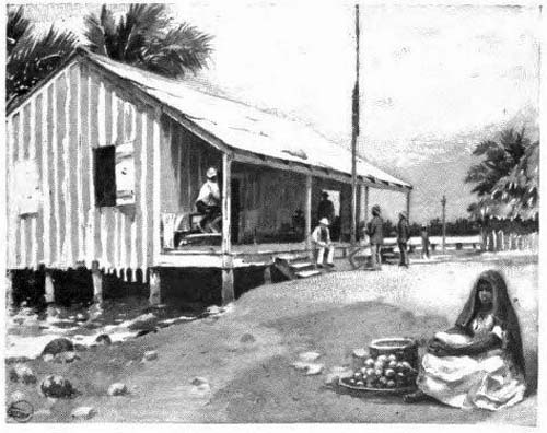 There are three great buildings in Caracas—the Federal Palace, the Opera-house, and the Pantheon, which was formerly a church, and which has been changed into a receiving-vault and a memorial for the great men of the country. Here, after three journeys, the bones of Bolivar now rest. The most interesting of these buildings is the Federal Palace. It is formed around a great square filled with flowers and fountains, and lit with swinging electric lights. It is the handsomest building in Caracas, and within its four sides are the chambers of the upper and lower branches of the legislature, the offices of the different departments of state, and the reception-hall of the president, in which is the National Portrait Gallery. The palace is light and unsubstantial-looking, like a canvas palace in a theatre, and suggests the casino at a French watering-place. It is painted in imitation of stone, and the statues are either of plaster-of-paris or of wood, painted white to represent marble. But the theatrical effect is in keeping with the colored walls and open fronts of the other buildings of the city, and is not out of place in this city of such dramatic incidents.
