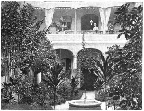[248]Even without acquaintances among the people of the capital there are enough public show-places in Caracas to entertain a stranger for a fortnight. It is pleasure enough to walk the long, narrow streets under brilliantly colored awnings, between high one- and two-story houses, painted in blues and pinks and greens, and with overhanging red-tiled roofs and projecting iron balconies and open iron-barred windows, through which you gain glimpses beyond of cool interiors and beautiful courts and gardens filled with odd-looking plants around a splashing fountain.