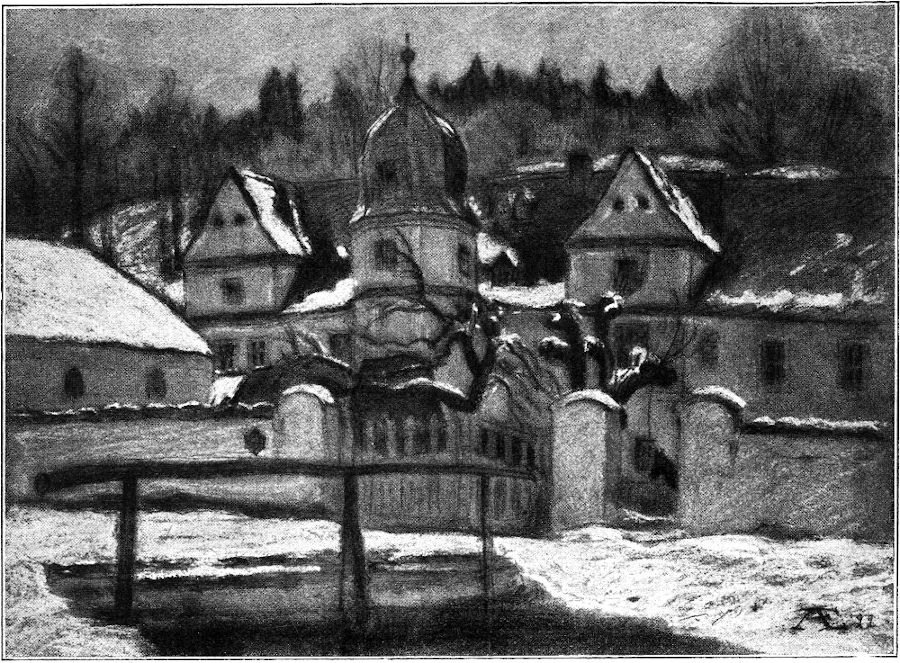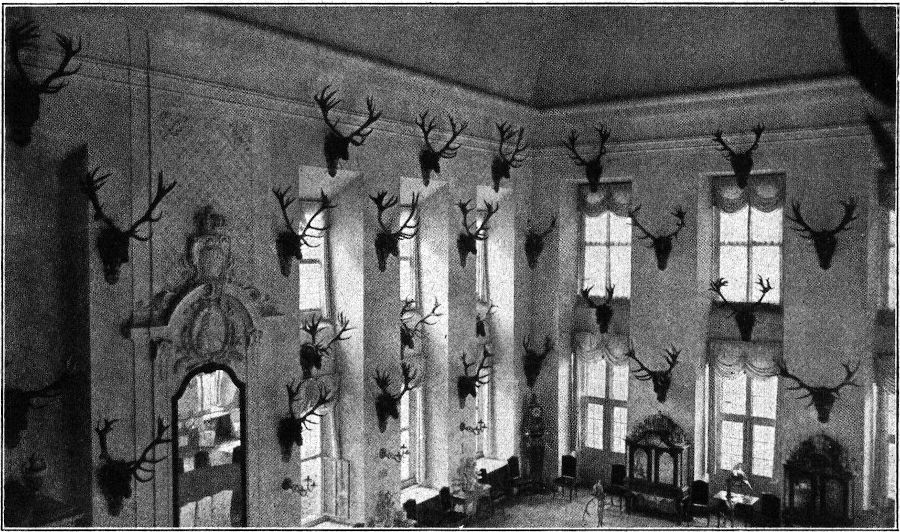 Den Bedürfnissen eines längeren Aufenthalts der Besitzer und ihrer Gäste entsprechend, machten sich später einige Ergänzungen erforderlich. In der Nähe[257] entstand ein Stallgebäude und ein schlichtes Haus für Hofpersonal und Küche. Ein Schmuckstück für sich ist die im Jahre 1879 nach Plänen der Meyerschen Kunstanstalt in München in skandinavischer Bauweise errichtete winzige Kapelle. In den neunziger Jahren des vorigen Jahrhunderts erhielt die Südseite des Schlosses einen niedrigen spitzbedachten Turm. War das Bauwerk, streng genommen, zuerst nur ein Jagdhaus gewesen, so konnte es nunmehr Anspruch auf den Namen Schloß erheben; denn nach landläufigen Begriffen gehört nun einmal zu jedem Schloß ein Turm.