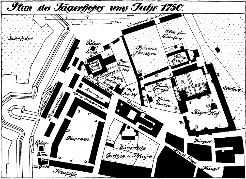 Neubauten entstanden noch 1720, 1722, 1723. Im Jahre 1740 kam der 90 Ellen lange und 14 Ellen breite englische Hundestall hinzu. 1743 beantragte der Oberhofjägermeister Graf Wolffersdorf den Bau eines Stockwerks auf das große Vordergebäude des Jägerhofes als Dienstwohnung für sich und erbot sich, die Baukosten von 10 000 Talern gegen ratenweise Rückzahlung vorzuschießen. Das Bauholz wurde der Heide entnommen. Nach einem Plan, der die Lage des Jägerhofes ums Jahr 1750 zeigt, enthält dieser folgende Gebäude und Plätze: Der Jägerhof, ein freier Platz, auf dem Wassertröge für die Hunde und einige große Linden standen, wurde umsäumt nach Westen von dem langen und alten Zeughaus, das nach Süden in das Hauptgebäude nach der Straßenfront zu überging, dasselbe enthielt im Parterre die englischen Hundeställe, darüber war der große Jägersaal. Im Parterre waren noch die Reise- und Jagdwagen untergebracht. In dem anschließenden westlichen Flügel war die Pirschmeisterwohnung. Auf der anderen Seite des Eingangstores war das vordere hohe Zeughaus. Der Jägerhofplatz wurde nach Norden abgeschlossen durch das Wildbretgewölbe, den Hundezwinger[220] und das Jägerwirtshaus. Hinter diesem Gebäudeblock war zunächst das hohe Zeughaus, von ihm durch einen schmalen Gang getrennt die Gebäude für die wilden Tiere: die sogenannten Affenstuben, Tiger- und Löwenfänge und die Wohnung für den Löwenwärter. Die ganze Anlage hieß das Löwenhaus, zu dem noch ein großer freier Platz gehörte. Gleich neben dieser Anlage befand sich der Bärengarten mit dem Bärenfang. Der Bärengarten wurde nach Süden von einem Wagenschuppen, nach Westen vom sogenannten Winterlager und nach Norden von den Ställen für die Kommissariatspferde abgeschlossen. Weitere Plätze waren noch der Jagdzimmerhof, Jagdröhrenhof und Auslaufplätze für die Hunde.