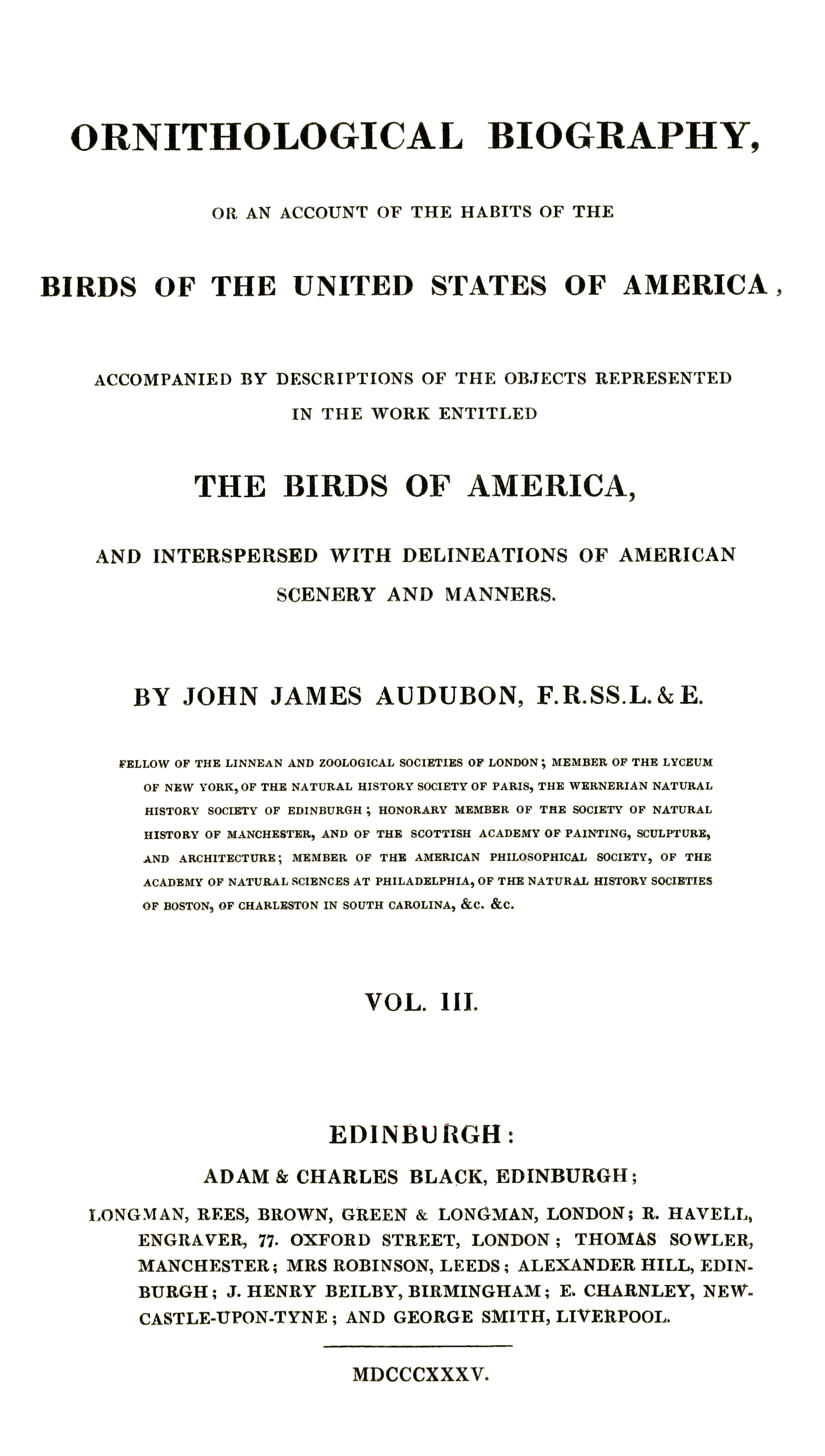 FELLOW OF THE LINNEAN AND ZOOLOGICAL SOCIETIES OF LONDON; MEMBER OF THE LYCEUM OF NEW YORK, OF THE NATURAL HISTORY SOCIETY OF PARIS, THE WERNERIAN NATURAL HISTORY SOCIETY OF EDINBURGH; HONORARY MEMBER OF THE SOCIETY OF NATURAL HISTORY OF MANCHESTER, AND OF THE SCOTTISH ACADEMY OF PAINTING, SCULPTURE, AND ARCHITECTURE; MEMBER OF THE AMERICAN PHILOSOPHICAL SOCIETY, OF THE ACADEMY OF NATURAL SCIENCES AT PHILADELPHIA, OF THE NATURAL HISTORY SOCIETIES OF BOSTON, OF CHARLESTON IN SOUTH CAROLINA, &C. &C.