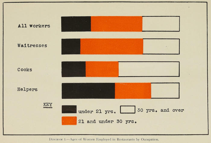An outstanding feature of restaurant work is the presence in this occupation of a very large proportion of girls and young women. One-fourth of all the workers are under 21, and two-thirds under 30 years of age. (See Diagram 1). There are several reasons to account for this fact.