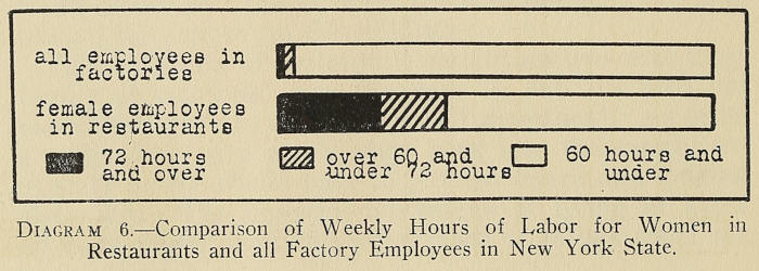 Comparing the hours of labor of these women with the hours of labor of all employees, both male and female, in the factories of New York State, four per cent. of the factory employees and thirty-five per cent. of the women restaurant employees work over sixty hours a week. Two per cent. of the factory employees and twenty per cent. of the women in restaurants work seventy-two hours or over.[4]