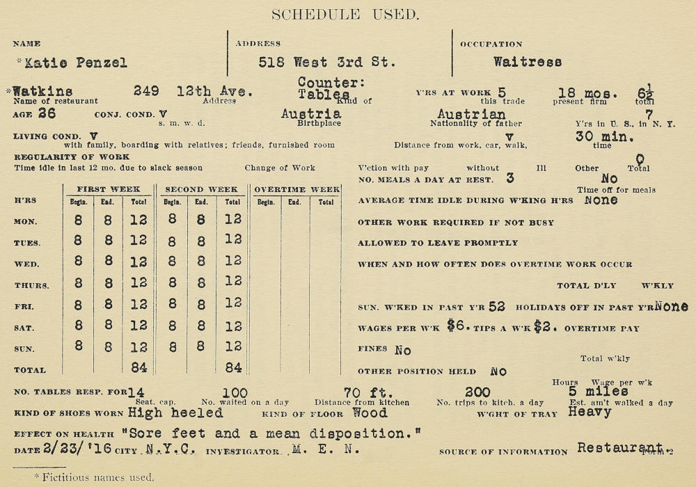 Between fifteen and twenty thousand of these women are workers in restaurants—waitresses, cooks, kitchen girls, pantry hands—upon whose services all of us depend at one time or another for our comfort and pleasure. The Consumers’ League of New York City has long felt the need of including restaurant workers under the provisions of the Labor Law. The State Department of Labor lays special stress upon this need.[1] Believing, therefore, both from casual observation and from the statement of the Labor Department that women in restaurants are not properly guarded from industrial strain, the League planned to explore the field further, to discover just what actually are the hours, wages and general conditions[2] of work in this branch of industry and to learn their effect upon the life and health of the worker.