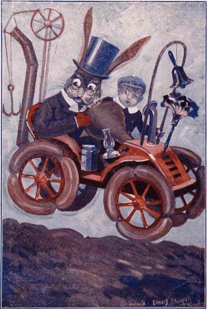 So, altogether, Uncle Wiggily had a good time in his hollow-stump bungalow which was built in the woods. When he had nothing else to do Mr. Longears would go for a ride in his airship. This was made of a clothes-basket, with toy circus balloons on it to make it rise up above the trees. Or Uncle Wiggily might take a trip in his automobile, which had big bologna sausages on the wheels for tires. And whenever the rabbit gentleman wanted the automobile wheels to go around faster he sprinkled pepper on the sausages.