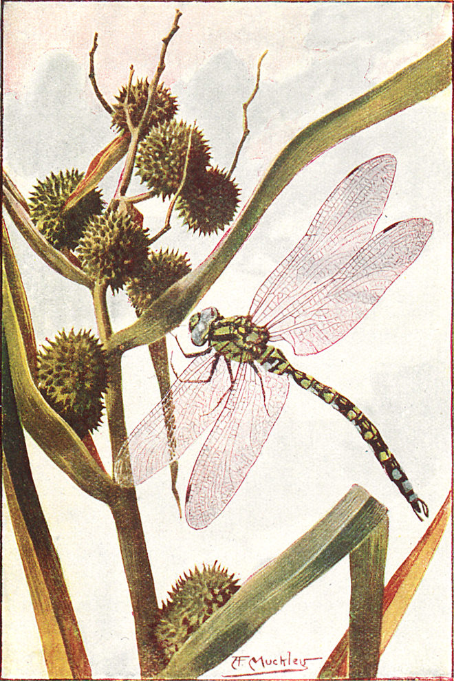 Mücken schweben über dem Teiche hin und her, und außerdem sehen wir ein Gewimmel von jenen Fliegen mit so feinen, durchsichtigen Flügeln, daß sie fast wie Gaze aussehen. Sie heißen Eintagsfliegen. Und jetzt erhebt sich ein weit prächtigeres Insekt, 7,5 cm lang mit vier großen Gazeflügeln, aus den Binsen und fliegt über den Teich.