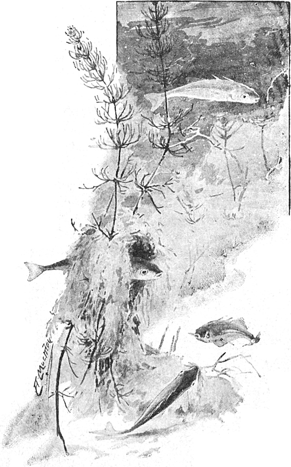 Als das Nest fertig war, schwamm er fort, um eine Gefährtin zu suchen. Er kam bald mit einer solchen zurück, einem kleinen Fisch,[S. 20] der nicht so glänzend war wie er. Er spielte mit dem Weibchen, trieb es vor sich her und schmeichelte ihm, bis es zuletzt in das eine Loch des Nestes hineinschwamm und nach einer Weile am anderen Ende wieder herauskam.