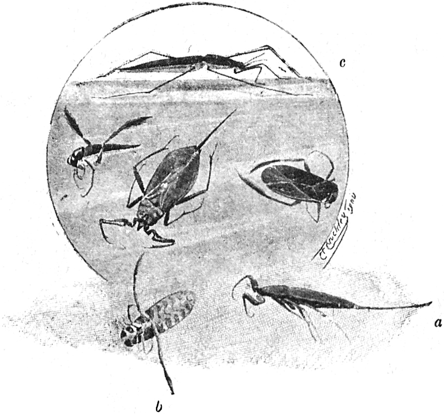 Die Augen befinden sich an der Seite des Kopfes und sind sehr groß, so daß die Ruderwanze nach oben und unten sehen kann. Das ist sehr nützlich für sie, denn sie schwimmt zwischen die Kaulquappen und Larven und ergreift sie mit den Klauen. Dann[S. 34] sticht sie die Beute mit dem scharfen Rüssel an und saugt alle Flüssigkeit aus ihrem weichen Körper. Die Ruderwanze schwimmt stets im Wasser oder kriecht im Schlamm. Abends kommt sie manchmal an die Wasseroberfläche und fliegt zu einem anderen Teiche oder Graben.