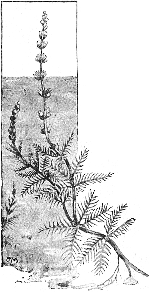 „Nun müssen wir noch eine andere finden. Eine kleine Pflanze, das ährige Tausendblatt, die fast ganz unter dem Wasser wächst, außer der Ähre mit den zierlichen rötlichen Blüten, die über die Oberfläche hervorragt. Sieh die hübschen Blätter an, die sternartig um den Stengel stehen und so schön im Wasser ausgebreitet sind.[S. 45] Wenn du die Blüten genau ansiehst, so wirst du bemerken, daß die oberen nur Staubbeutel und die unteren nur Fruchtknoten tragen. Aber sie sind so klein, daß sie nicht leicht zu sehen sind.“