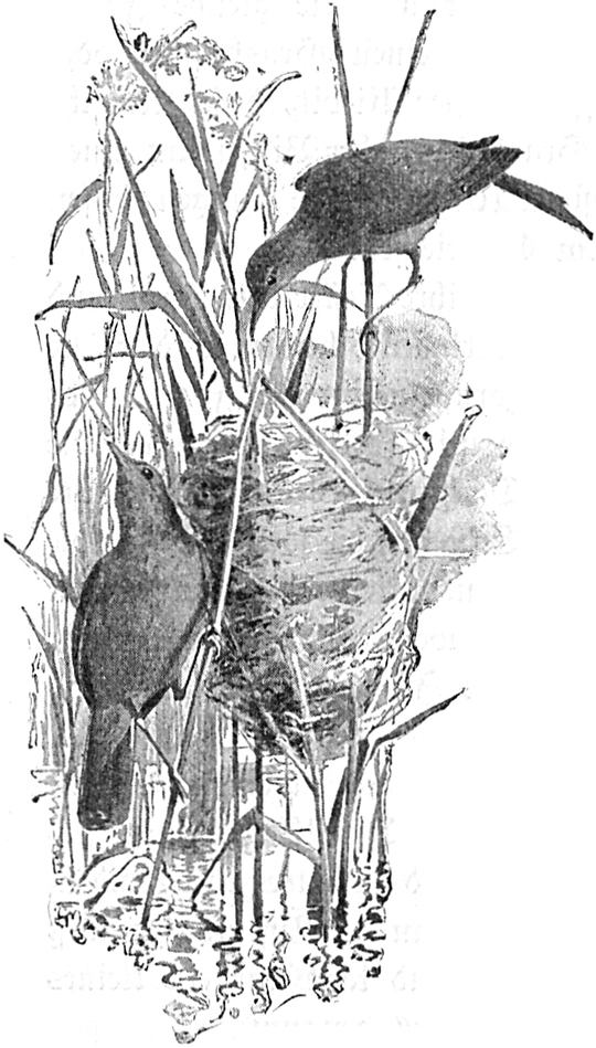 Die kleinen Singvögel, wie die Drossel, die Nachtigall[S. 16] und das Rotkehlchen bauen hübsche tassenförmige Nester. Die Rohrsänger bauen ein Nest um zwei oder drei Schilfstengel oder andere Pflanzen in der Nähe des Wassers. Es ist aus Grashalmen gemacht und mit Wasserpflanzen ausgepolstert. Der Zaunkönig, die langschwänzige Meise und der kleine Weidenlaubsänger bauen kugelförmige Nester mit einem Loch an einer Seite. Der letztere polstert das seinige mit einer schönen, weichen Federdecke aus.