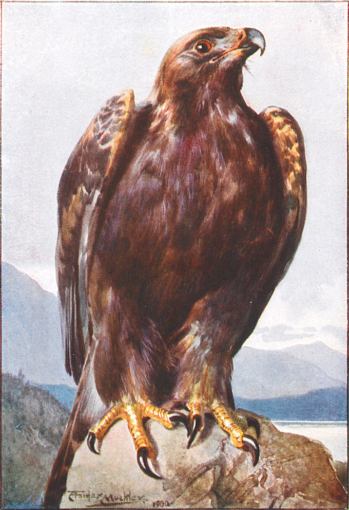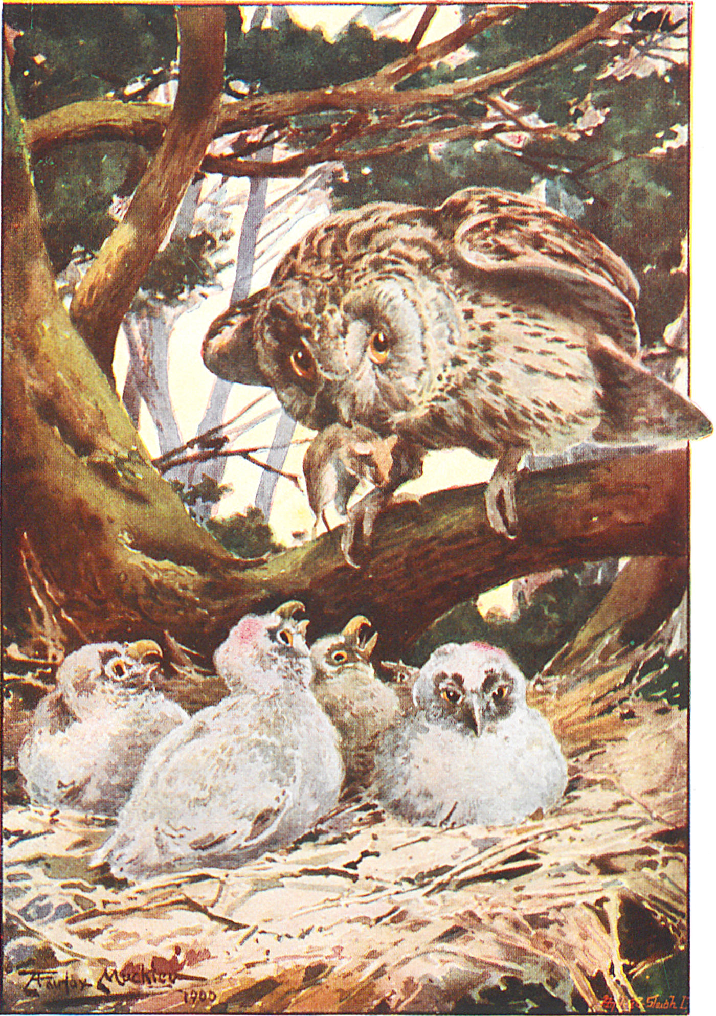 Wenn man in den bayrischen Bergen wohnt, bekommt[S. 52] man vielleicht einen Adler (siehe bunte Tafel VI) zu sehen. Aber im allgemeinen sieht man hauptsächlich Falken und Eulen.