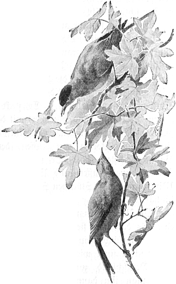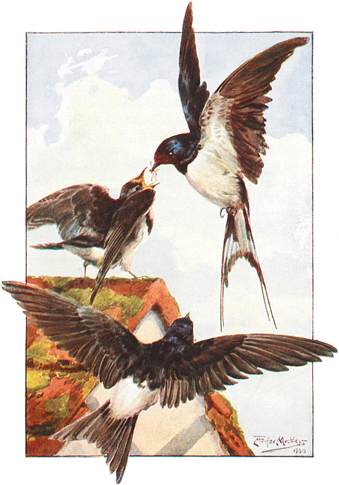 Die meisten Vögel, die ihr kennt, pflegen das ganze Jahr bei uns zu bleiben. Aber nicht alle tun dies. Der Segler (Turmschwalbe) beginnt schon Ende Juli nach dem Süden zu ziehen, und die Hausschwalbe und Mauerschwalbe folgen im Oktober. Wenn sie fort sind, kommen Schwärme[S. 9] von Krammetsvögeln aus dem Norden und fressen von den roten Beeren der Eberesche und von den schwarzen Holunderbeeren.