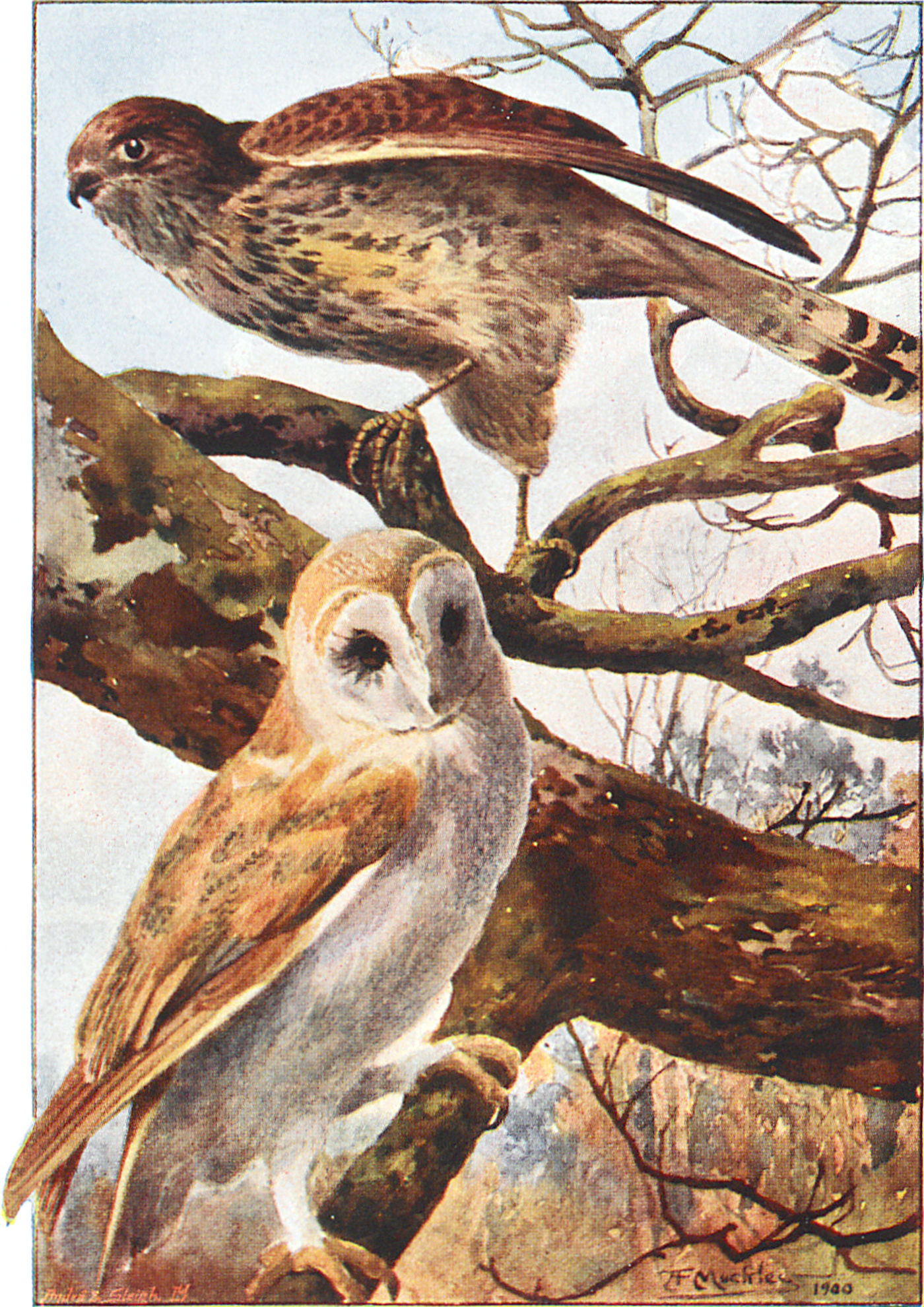 Die Schleiereule ist ein viel heller gefärbter Vogel als der Waldkauz. Ihr Rücken und ihre Flügel sind bräunlich und Brust und Kopf sind weißlich. Ihr Schrei ist ein widerlich kreischendes „Crüüüh“. Sie verbirgt sich am Tage in Scheunen und in Kirchtürmen und jagt in der Nacht; sie nährt sich hauptsächlich von Mäusen. Wenn sie am Tage herauskommt, necken sie Buchfinken und andere kleine Vögel, denn diese wissen, daß sie nicht gut sehen kann.