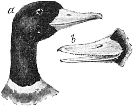 Dann beobachtet sie beim Fressen. Sie watschelt gierig schlingend durch den Schmutz und wirft oft den Kopf in die Höhe, um größere Bissen, die sie gefunden hat, hinunterzuschlucken. Ihr Schnabel ist breit und flach. Der Oberschnabel endet in einer nach unten gebogenen Hornspitze, und weiter nach oben ist er mit einer weichen, nervenreichen Haut versehen. Damit fühlt die Ente, was sich an genießbaren Dingen im Schlamme und Schmutze findet. Die Ränder des Schnabels sind hornig und scharf und sowohl oben als unten mit dünnen Hornzähnchen besetzt. Wenn die Ente den Schnabel schließt, so passen diese Zähnchen ineinander und bilden eine Art Sieb. Mit dem scharfen Schnabel schneidet sie die Wasserpflanzen ab und tötet sie die Schnecken. Mit dem Sieb sondert sie den Schlamm von der Nahrung in ihrem Schnabel und stößt das Wasser mit der dicken Zunge hinaus. Gänse, Schwäne und alle[S. 64] wilden Enten haben Füße und Schnäbel wie die unserer zahmen Ente.